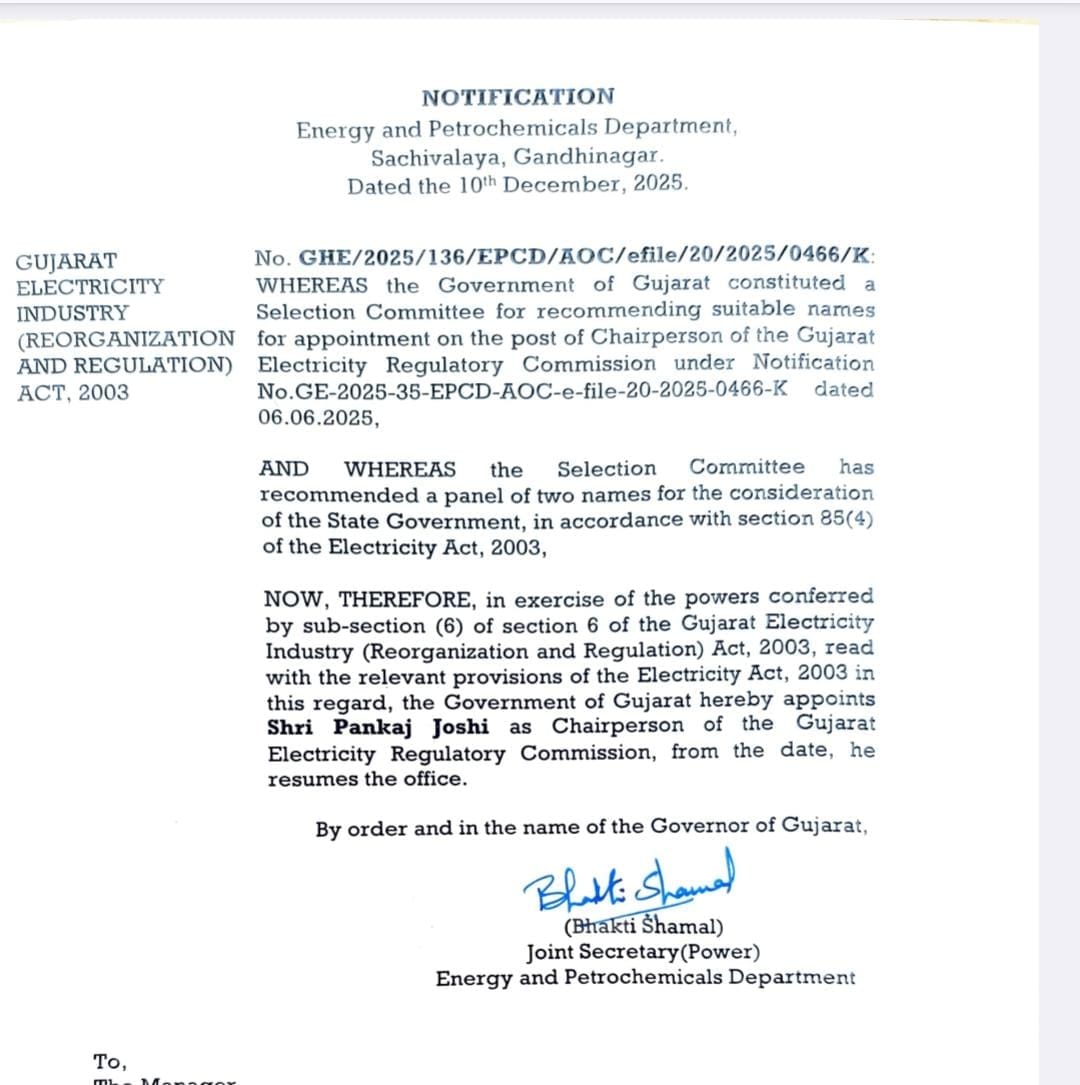 ગુજરાતના પૂર્વ મુખ્ય સચિવ પંકજ જોષીની ગુજરાત વીજ નિયમન પંચના અધ્યક્ષ તરીકે નિમણૂંક કરવામાં આવી છે.