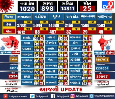 ગુજરાતમાં કોરોનાનાં નવા 1020 પોઝિટિવ કેસ,25 લોકોનાં મોત ,898 લોકો ડિસ્ચાર્જ,કુલ સ્વસ્થ થયેલા લોકોનો આંકડો 48359 પર પહોચ્યો