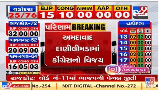 Gujaratમાં 6 મહાનગરપાલિકાના સામે આવેલા પરિણામ મુજબ અમદાવાદ મહાનગરપાલિકામાં અત્યાર સુધી અનેક વોર્ડમાં ભાજપની પેનલ જીતી છે. તેવા સમયે અમદાવાદ શહેરમાં દાણીલીમડા વોર્ડમાં કોંગ્રેસની પેનલે વિજય મેળવ્યો છે.