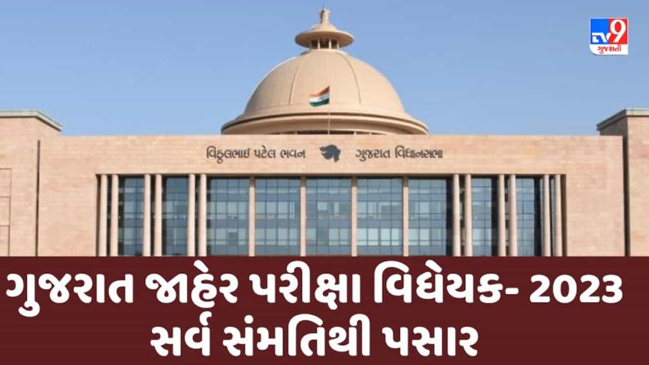 ગુજરાત વિધાનસભામાં ગુજરાત જાહેર પરીક્ષા વિધેયક- 2023 સર્વ સંમતિથી પસાર કરવામાં આવ્યું છે. વારંવાર ફૂટતા પેપરે ગુજરાતની પરીક્ષા પધ્ધતિ પર અનેક સવાલો અને વિવાદો ઊભા કર્યા, જોકે હવે સરકારે તેની પર નો ટોલરન્સ નીતિ અપનાવી છે .ભરતી પરિક્ષામાં ગેરરીતિ અટકાવવા વિધાનસભામાં ગૃહમંત્રી હર્ષ સંઘવીએ રજૂ કરેલું વિધેયક પસાર થઈ ગયું છે. જેમાં પેપર ફોડનાર સામે કોઈ ચોક્કસ કાયદો ના હોવાના કારણે તેઓને છૂટવાનો અવસર મળતો હતો. જેના લીધે ભવિષ્યમાં કોઈ પેપર ફોડવાની હિંમત કરશે તો 10 વર્ષની સજા અને એક કરોડનો દંડ થશે