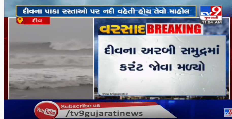 સૌરાષ્ટ્રમાં ભારે વરસાદની આગાહી વચ્ચે દિવમાં તોફાની પવન સાથે ભારે વરસાદ વરસ્યો છે. દીવના રસ્તાઓ ઉપર નદી વહેતી હોય તેમ વરસાદી પાણી વહ્યા. દિવનો દરિયો પણ ભારે તોફાની બન્યો છે. સામાન્ય રીતે મોજા ઉછળતા હોય છે તેનાથી વધુ ઊંચા મોજા ઉછળ્યા છે. દિવના વહીવટીતંત્રે માછીમારોને દરિયા નહી ખેડવા સુચના આપી છે. જુઓ વિડીયો.