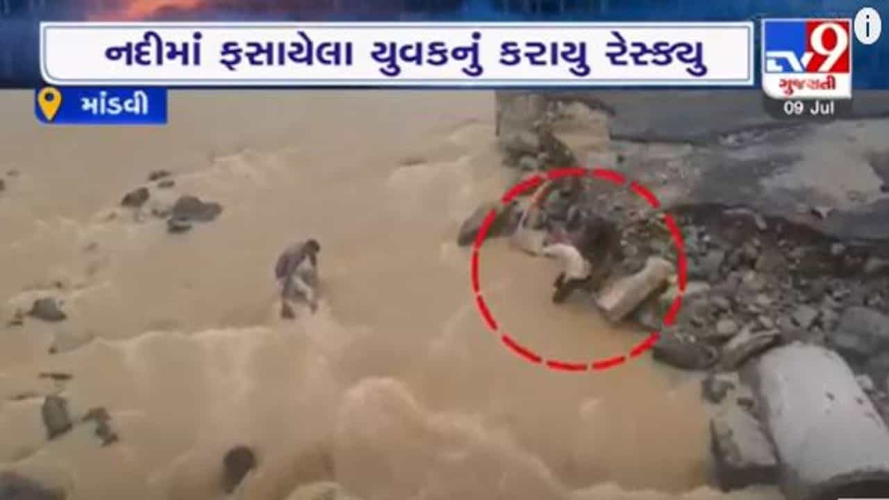 દરમિયાન માંડવીની રૂકમાવતી નદીના ધસમસતા પાણીમાં એક યુવક ફસાઈ ગયો હતો. આ યુવકને ભારે જહેમતથી માંડવી પોલીસ (Mandvi Police) જવાનોએ બચાવ્યો હતો. માંડવીમાં ભારે વરસાદને પગલે રૂકમાવતી નદી બે કાંઠે વહી ઉઠી હતી અને તેમાં આ યુવક ફસાઈ ગયો હતો. જોકે પોલીસ જવાનોએ તેને જહેમત પૂર્વક બચાવી લીધો હતો.