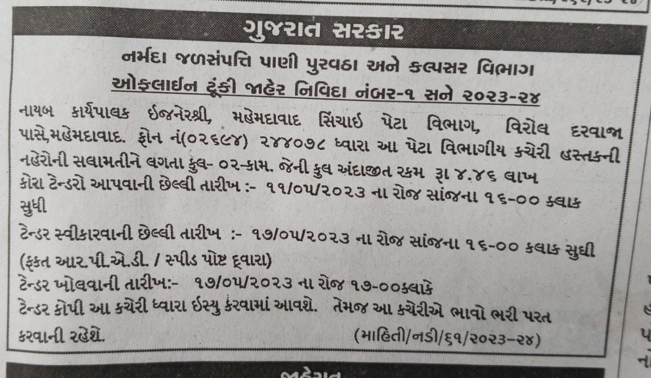 નર્મદા જળસંપત્તિ પાણી પુરવઠા અને કલ્પસર વિભાગ દ્વારા નહેરોની સલામતીને લગતા બે કામ માટે ટેન્ડર જાહેર કરવામાં આવ્યુ છે. નાયબ કાર્યપાલક ઇજનેર, મહેમદાવાદ સિંચાઇ પેટા વિભાગ, વિરોલ દરવાજા પાસે, મહેમદાવાદ દ્વારા આ પેટા વિભાગીય કચેરી હસ્તકની નહેરોની સલામતીને લગતા કુલ 2 કામ માટે આ ટેન્ડર જાહેર કરાયુ છે.