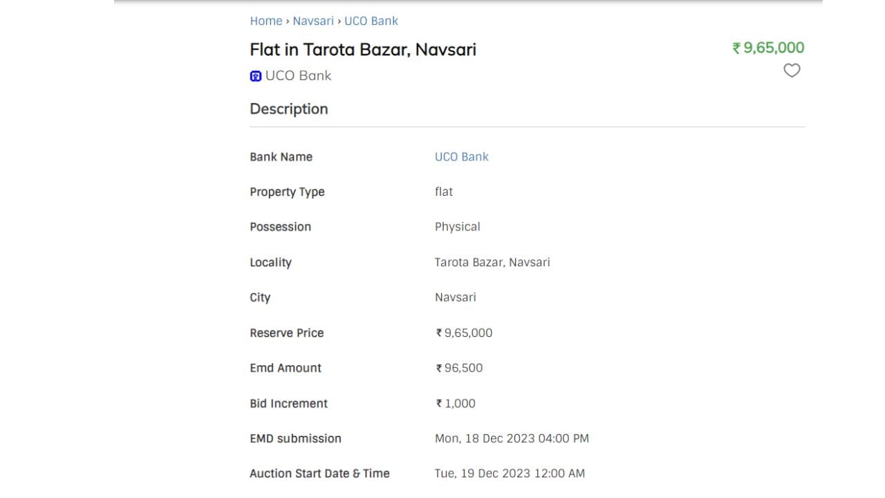 તેની રિઝર્વ કિંમત 9,65,000 રુપિયા રાખવામાં આવી છે. અર્નેસ્ટ મની ડિપોઝીટની રકમ 96,500 રુપિયા રાખવામાં આવી છે. બીડ વૃદ્ધિની રકમ 1000 રુપિયા છે. અર્નેસ્ટ મની ડિપોઝીટ સબમીશનની તારીખ 18 ડિસેમ્બર 2023, સોમવારે બપોરે 4 કલાકની રાખવામાં આવી છે.તો ઇ-હરાજીની તારીખ 19 ડિસેમ્બર 2023,મંગળવારે બપોરે 12 કલાકની રાખવામાં આવી છે.