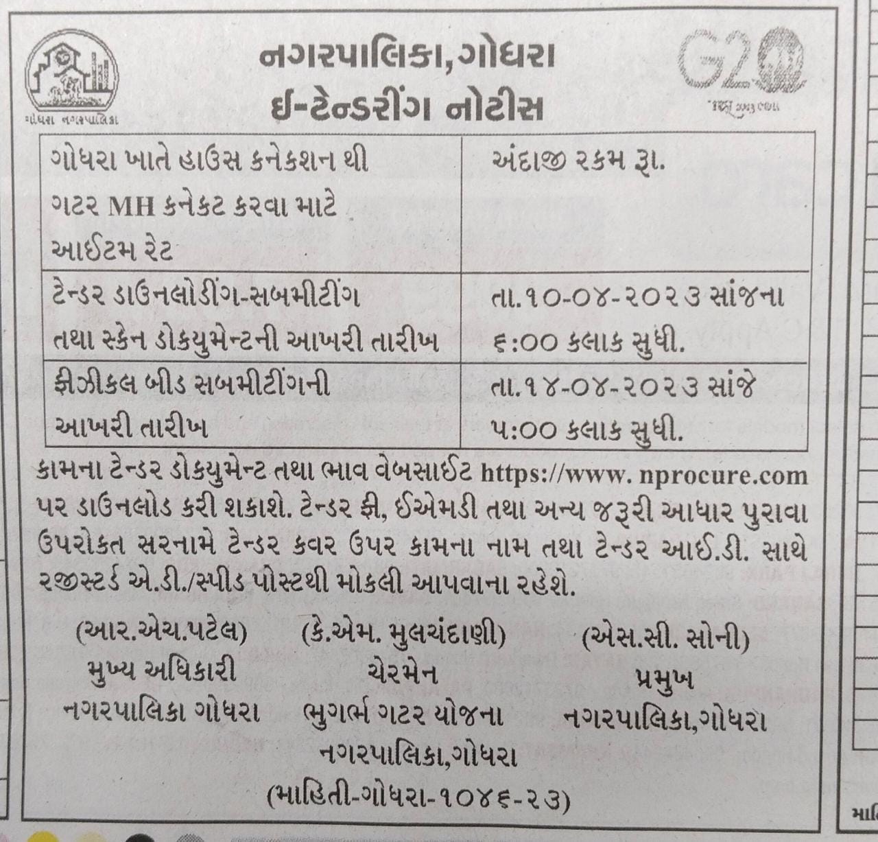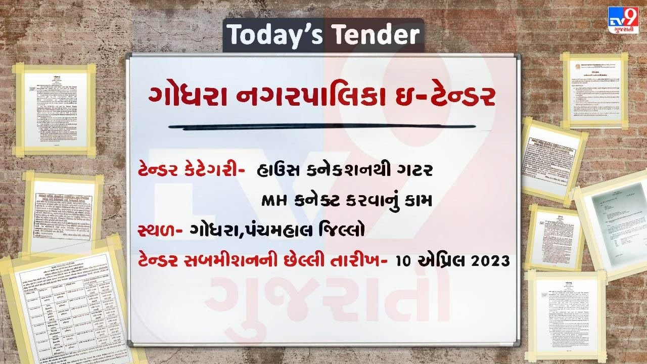 ગુજરાતની જ એક નગરપાલિકા દ્વારા હાઉસ કનેક્શનથી ગટર MH કનેક્ટ કરવા આઇટમ રેટ મગાવવામાં આવ્યા છે. આ માટે ઇ-ટેન્ડર જાહેર કરવામાં આવ્યુ છે. ગોધરા નગરપાલિકાના કામો માટે આ ટેન્ડર જાહેર કરવામાં આવ્યુ છે. ટેન્ડર ડાઉનલોડિંગ-સબમીટિંગ તથા સ્કેન ડોક્યુમેન્ટની છેલ્લી તારીખ 10 એપ્રિલ 2023 સાંજે 6 કલાક સુધીની છે.