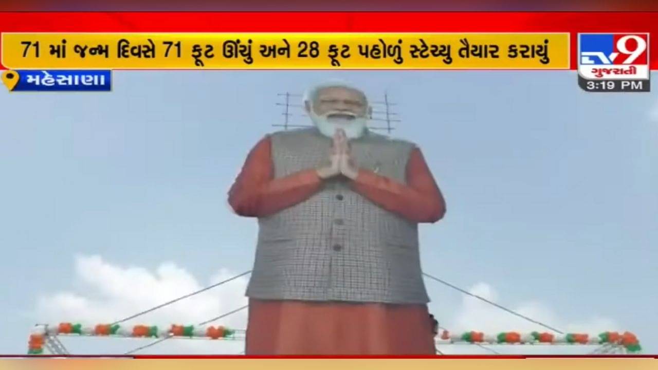 વડાપ્રધાન મોદીના જન્મદિવસની મહેસાણામાં અનોખી ઉજવણી કરવામાં આવી. તમને જણાવી દઈએ કે આ વર્ષે વડાપ્રધાન પોતાનો 71 મો જન્મદિવસ ઉજવી રહ્યા છે. આ પ્રસંગે મહેસાણામાં PM મોદીનું 71 ફૂટ ઊંચું અને 28 ફૂટ પહોળું સ્ટેચ્યુ તૈયાર કરાયું. આ ભવ્ય સ્ટેચ્યુનું ભાજપ પ્રદેશ અધ્યક્ષ સી આર પાટીલના હસ્તે અનાવરણ કરવામાં આવ્યું હતું.