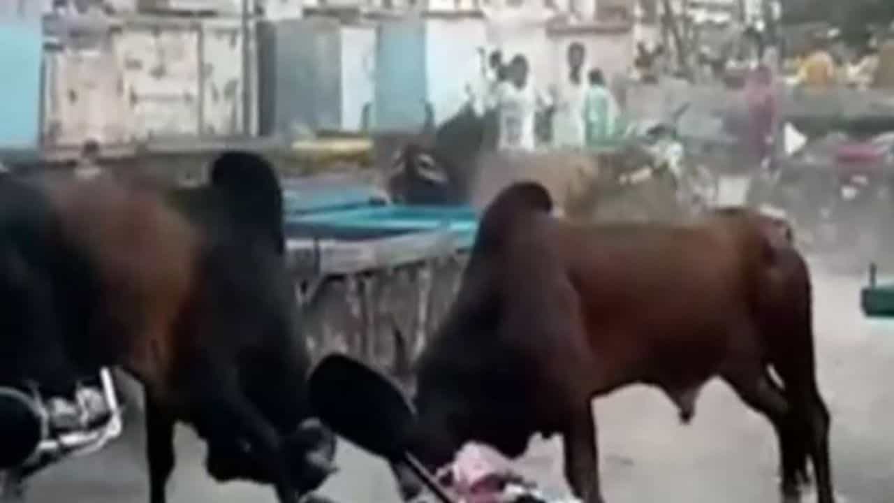 પોરબંદરમાં(Porbandar) શહેરમાં લીમડા ચોક પાસે બે આખલા (Stray bulls)ઝઘડયા હતા અને તેના પગલે શાક માર્કેટમાં નાસભાગ મચી ગઈ હતી. આખલા યુદ્ધના પગલે લીમડા ચોકમાં કેટલાય વાહનો તથા રેકડીઓનો કચ્ચરઘાણ વળી ગયો હતો. પોરબંદરમાં રખડતા ઢોરોનો ત્રાસ વધી ગયો હોવા છતાં તંત્ર આ સમસ્યા સામે બેદરકાર છે અને નક્કર પગલાં ન લેવાતાં રખડતાં ઢોરનો ભોગ નાગરિકો બની રહ્યા છે.
