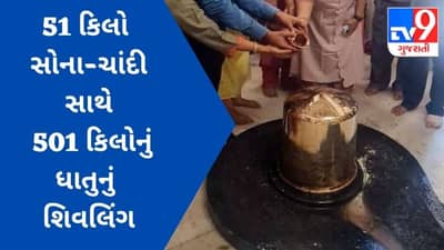 સુરત(Surat) ના વેસુ વિસ્તારમાં એક સોસાયટીમાં 51 કિલો સોના ચાંદી સાથે 501 કિલો ધાતુના શિવલિંગ (Shivling)ની પ્રાણ પ્રતિષ્ઠા કરવામાં આવી છે . તેમજ ધાતુનું આ પ્રકારનું અનોખું અને અદભૂત શિવલિંગ છે.
