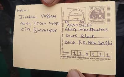 જીતુભાઇ વાધાણીએ એડ્રેસ પણ આપ્યું જેમાં આર્મી ચીફ, આર્મી હેડક્વાર્ટર, સાઉથ બ્લોક,ડીએચક્યુ , પી ઓ, નવી દિલ્હી , 110011નો ઉલ્લેખ કરાયો.