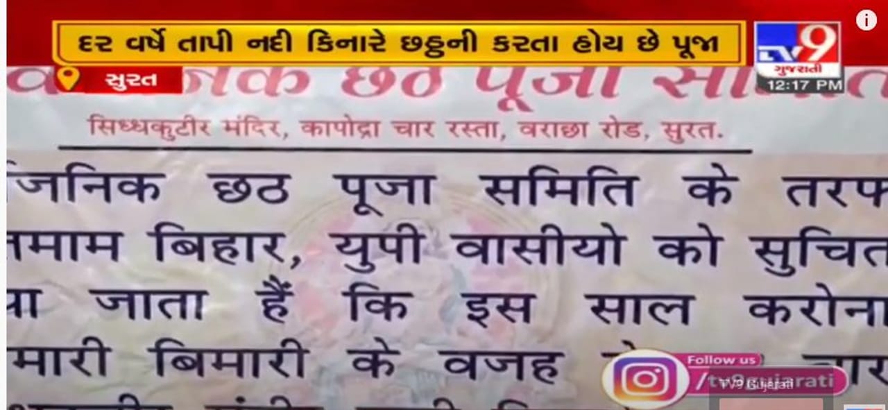સુરતમાં વસતા 8 લાખ ઉત્તર ભારતીયો છઠ્ઠ પૂજા ઘરે કરશે. ઉત્તર ભારતીય લોકો દર વર્ષે તાપી નદી કિનારે છઠ્ઠની પૂજા કરતા હોય છે. ઉગતા સૂર્યની અને આથમતા સૂર્યની પૂજા કરતા હોય છે. આ વર્ષે તાપી કિનારે કોઈ વ્યવસ્થા ન કરાઇ હોવાથી ઓવારા પર લોકો એકત્ર થશે નહીં. કોરોનાને લઈ સુરત મનપા દ્વારા આ વખતે જાહેરમાં પૂજા કરવા માટેની પરવાનગી આપવામાં આવી નથી. મનપા દ્વારા પરવાનગી ન મળતા છઠ્ઠ પૂજા આયોજન સમિતિ દ્વારા કોઈ વ્યવસ્થા કરી નથી. સુરતના અડાજણ , જહાંગીરપુર ,ઉધના, પાંડેસરા , સિંગણપોર વિસ્તારમાં છઠ્ઠ પૂજાનું આયોજન કરાય છે.