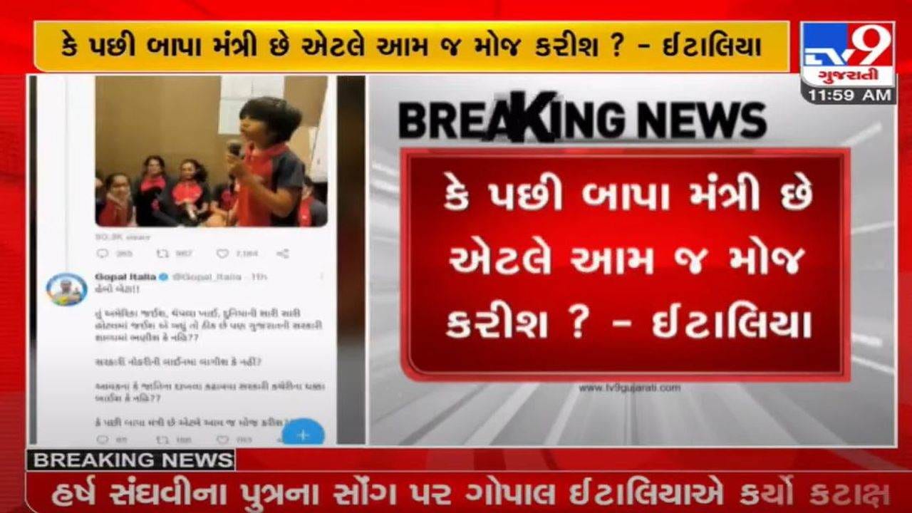 ગૃહ રાજ્ય પ્રધાન હર્ષ સંઘવીના (Home Minister Harsh Sanghvi) પુત્ર આરૂષના વાયરલ થયેલા સોંગ પર હવે રાજનીતિ શરૂ થઈ છે. (AAP) આમ આદમી પાર્ટીના પ્રદેશ પ્રમુખ ગોપાલ ઈટાલિયાએ (Gopal Italia)ટ્વિટ કરીને હર્ષ સંઘવીના પુત્રના સોંગ પર સંખ્યાબંધ કટાક્ષ કરતા સવાલ પૂછ્યા છે. ગોપાલ ઈટાલિયાએ ટ્વિટ કર્યું કે તું અમેરિકા જઈશ, થેપલા ખાઈ, દુનિયાની સારી હોટલમાં જઈશ એ બધું તો ઠીક છે પણ ગુજરાતની સરકારી શાળામાં ભણીશ કે નહીં ? કોઈ સરકારી નોકરીની લાઈનમાં લાગીશ કે નહીં કે પછી કે પછી બાપા મંત્રી છે એટલે આમ જ મોજ કરીશ ?