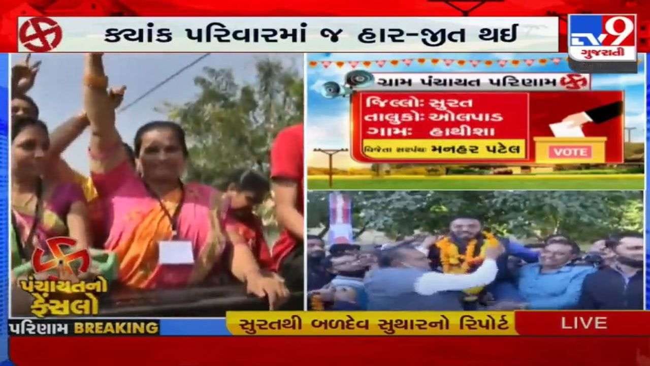 તો ઓલપાડના અછારણ ગામમાં જલ્પાબેન ચિંતન પટેલનો 424 મતથી વિજય થયો છે. ઓલપાડ તાલુકાના ખોસાડીયા ગામમાં સરપંચ તરીકે પ્રમોદ ગણપત પટેલ 183 મતથી વિજેતા જાહેર થયા છે. તો ઓલપાડ તાલુકાના હાથીશા ગામમાં સરપંચ તરીકે મનહર પટેલનો વિજય થયો છે.