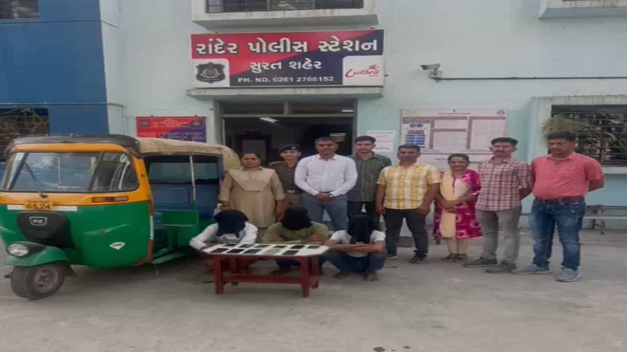 સુરત શહેરના અલગ અલગ વિસ્તારોમાં ફરી પેસેન્જરોને રીક્ષામાં બેસાડી નજર ચૂકવી મોબાઈલ તેમજ રોકડ રકમની ચોરી કરી લેતી ગેંગને રાંદેર પોલીસે ઝડપી પાડી છે. આ ઘટનામાં રાંદેર પોલીસે ત્રણ આરોપીની ધરપકડ કરી છે. તેમજ બે ગુનાના ભેદ ઉકેલી કાઢ્યા છે. એટલુ જ નહી આરોપીઓએ આવી રીતે સુરત અને અંકલેશ્વરમાંથી 30 જેટલા મોબાઈલ ફોનની ચોરી કરી હતી. જે પૈકીના 11 મોબાઈલ ફોન પણ પોલીસે રીકવર કર્યા છે.