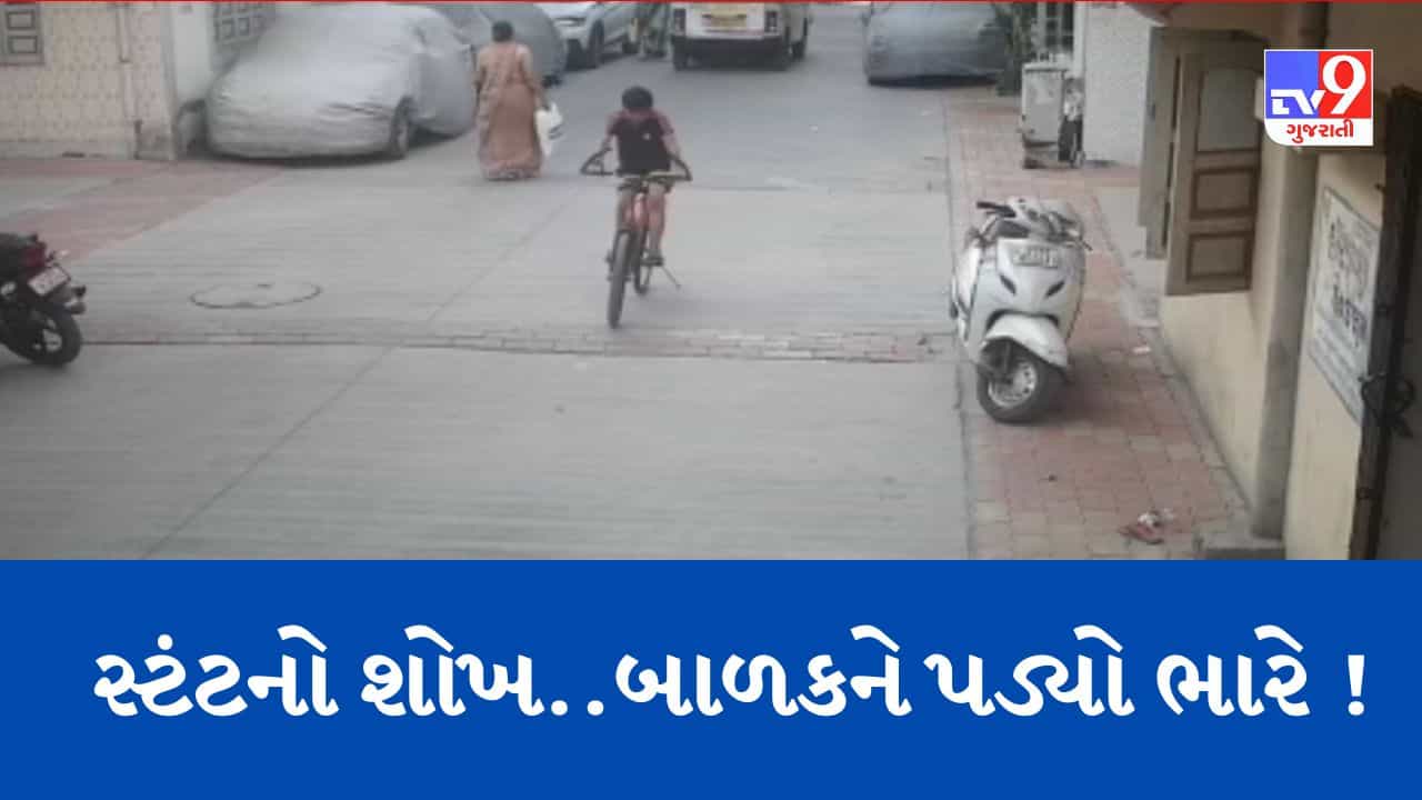 સુરતમાં વધુ એકવાર વાલીઓ માટે લાલબત્તિ સમાન કિસ્સો સામે આવ્યો છે. શહેરના કાપોદ્રા વિસ્તારમાં સાયકલ ચલાવતો બાળક સ્ટંટ કરવા જતા જતા ગોથું મારી જાય છે. જેને લીધે તેને માથાના ભાગે ગંભીર ઈજાઓ પહોંચે છે. સમગ્ર ઘટનાના CCTV ફુટેઝ સામે આવ્યા છે. જેમાં જોઈ શકાય છે, રસ્તા પર બાળક શાંતીથી સાયકલ લઈને જઈ રહ્યો હતો. પરંતુ રસ્તા પર સ્પિડ બ્રેકર આવતા સાયકલ સવાર બાળકે સાયકલને એક ટાયર પર ચલાવવાની કોશિષ કરી પરંતુ બેલેન્સ ન જળવાતા બાળક જમીન પર ઊંધે માથે પટકાયો હતો. અને બાળકને ગંભીર ઈજાઓ પહોંચી હતી. આજૂબાજુના લોકોએ તાત્કાલિક બાળકને ઉભો કરી સારવાર અર્થે ખસેડ્યો હતો અને સારવાર બાદ હાલ બાળકની સ્થિતિ સારી છે. જોકે સમગ્ર ઘટના દરેક વાલીઓ માટે ચેતવણી સમાન છે.