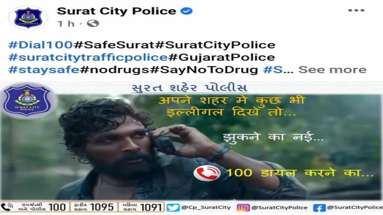 પુષ્પા ફિલ્મની આ લોકપ્રિયતાનો લાભ લઇ સુરત શહેર પોલીસે (Surat City Police)પણ એક સંદેશો શહેરીજનોને આપવાનો પ્રયત્ન કર્યો છે. જેમાં ફિલ્મના અભિનેતા અલ્લુ અર્જુનને તેની સ્ટાઈલમાં બતાવીને એક પોસ્ટર બહાર પાડવામાં આવ્યું છે. જેના પર લખવામાં આવ્યું છે કે અપને શહેર મેં કુછ ભી ઇલ્લીગલ દીખે તો ઝુકને કા નહીં, 100 ડાયલ કરને કા.સુરત પોલીસ દ્વારા લોકો સુધી સંદેશો પહોંચાડવા માટે સારો રસ્તો છે. કારણ કે હાલમાં લોકો સોસીયલ મીડિયામાં સતત નજર હોય છે અને લોકો તેમાં વ્યસ્ત હોય જેથી આ સંદેશ લોકોના નજરમાં વધુ આવી શકે છે.