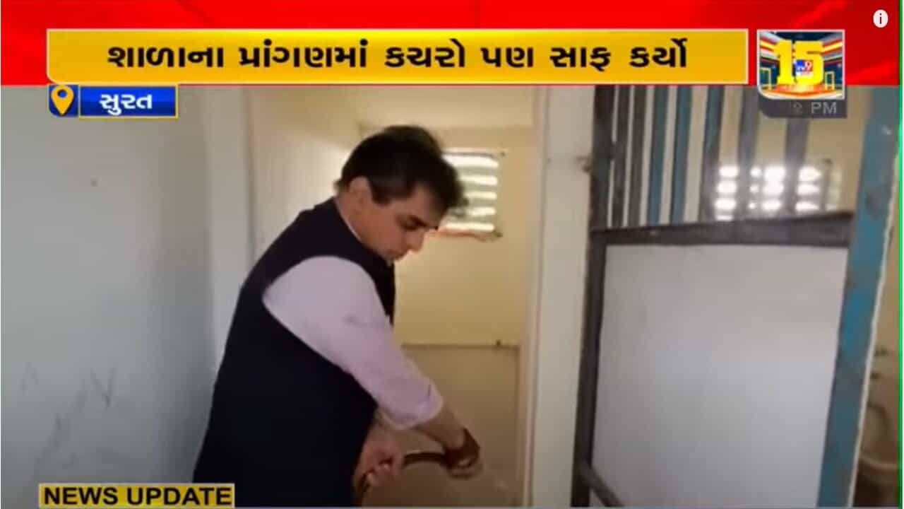 ગુજરાતના રાજ્ય શિક્ષણ મંત્રી પ્રફુલ પાનસેરીયાની એક અનોખી કામગીરી સામે આવી છે. રાજ્ય શિક્ષણ મંત્રી કામરેજ તાલુકાના ડુંગરા ગામની પ્રાથમિક શાળાની મુલાકાતે પહોંચ્યા હતા. જ્યાં વિવિધ શૈક્ષણિક પ્રવૃત્તિઓ અને વહીવટી કામગીરી નિરીક્ષણ કર્યું હતું. આ દરમિયાન શાળાની શૌચાલયની સ્થિતિ ખરાબ જણાતા તેમણે જાતે જ સાફ-સફાઈ શરૂ કરી દીધી હતી. અને શાળામાં સ્વચ્છતા અને સાફ-સફાઈ ને લઈ રાજ્યમાં અનોખો મેસેજ પ્રસ્તુત કર્યો હતો.