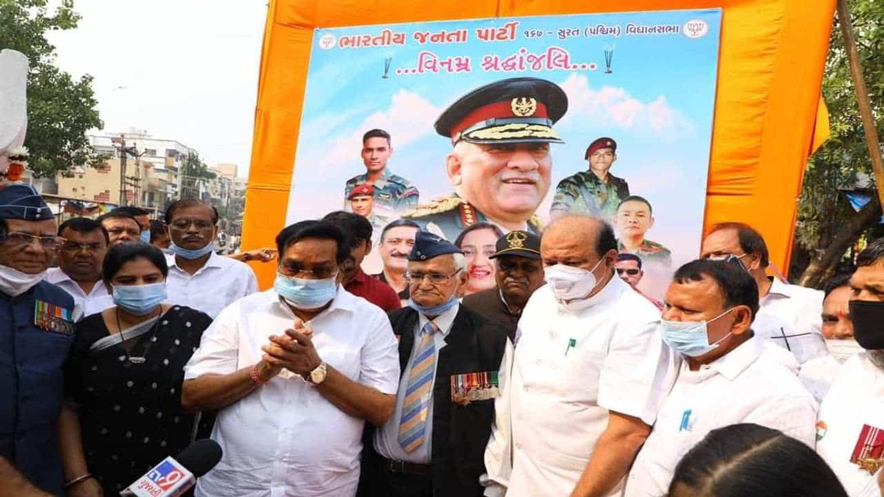 SURAT : તામિલનાડુના કૂંન્નુર ખાતે હેલીકૉપ્ટર ક્રેશના બનાવમાં દેશના ચીફ ડિફેન્સ સ્ટાફ બિપિન રાવત સહીત 12 જવાનો શાહિદ થયા હતા.આ દુઃખદ ઘટનાના પગલે સમગ્ર રાષ્ટ્રમાં શોક મનાવવામા આવી રહ્યો છે.તેમજ શહીદોને સમગ્ર દેશમાં ઠેર-ઠેર શ્રદ્ધાંજલિ આપવામાં આવી રહી છે.દરમિયાન શહેરમાં પણ જુદા જુદા સંગઠનો તેમજ સામાજિક સંસ્થાઓ સહિતના લોકો દ્વારા શ્રદ્ધાંજલિ આપી તેમને યાદ કરવામાં આવી રહયા છે.ત્યારે આજે સવારે પાલનપુર પાટિયા ખાતે સીડીએસ બિપિન રાવત સહીત જવાનોને શ્રદ્ધાંજલિ આપવામાં આવી હતી.