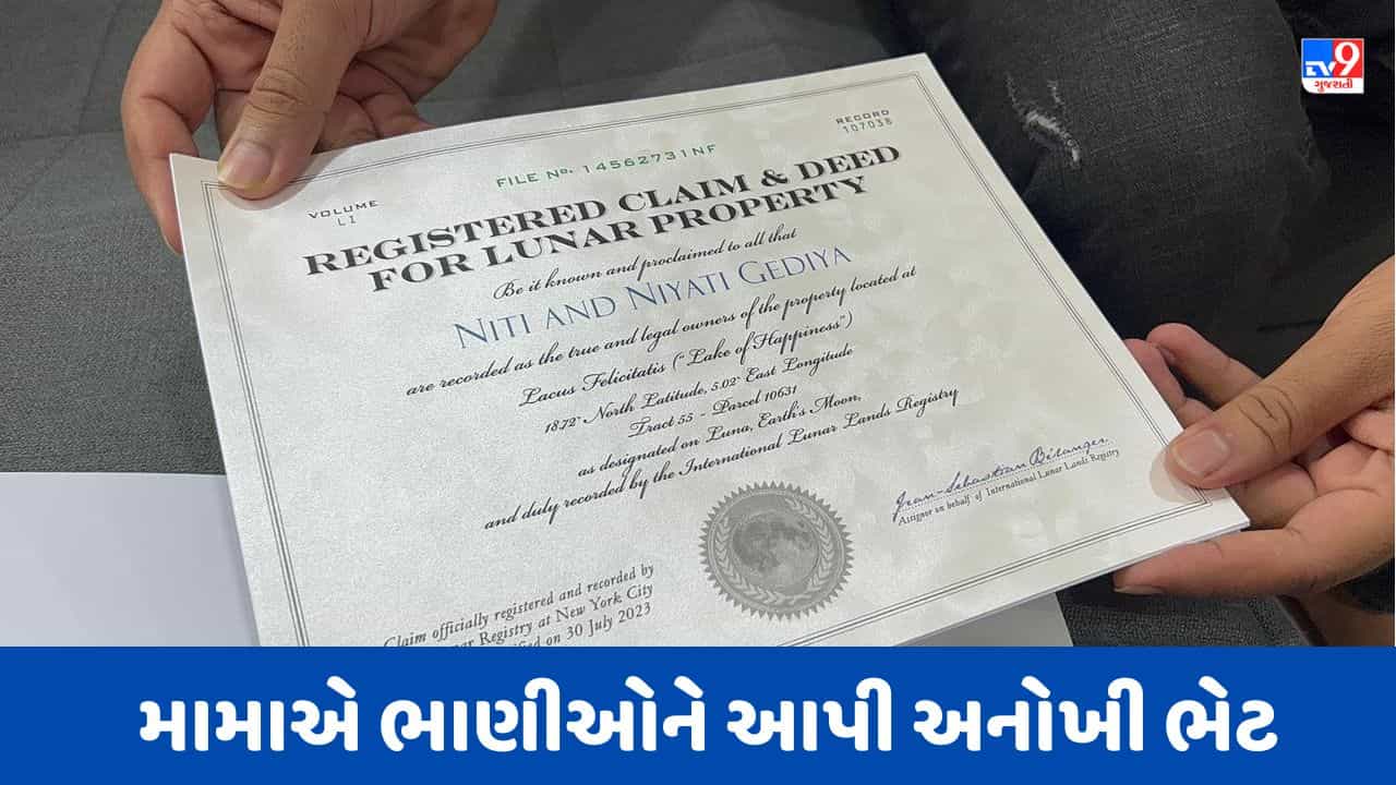 Surat : સુરતમાં એક મામાએ પોતાની બે જુડવા ભાણિઓ માટે ચંદ્ર પર એક એકર જમીન ખરીદી લીધી છે. આજ દિન સુધી ચાંદ ઉપર આટલી નાની વયમાં કોઈ જોડીયા બાળકોના નામે જમીન નથી. પરંતુ સુરત શહેરના સરથાણા વિસ્તાર ખાતે રહેતા બ્રિજેશ વેકરીયાએ પોતાની બે જોડીયા ભાણિઓ માટે ચંદ્ર પર જ એક એકર જમીન લઇ લીધી છે. જોકે તમામ માટે આ ઘટના હંમેશા યાદગાર બની રહેશે. કહેવાય છે કે મામાને હંમેશા જ પોતાની ભાણીઓ વાલી હોય છે. ત્યારે આ વાત સાચી સાર્થક સુરતના એક વ્યક્તિએ કરી છે.