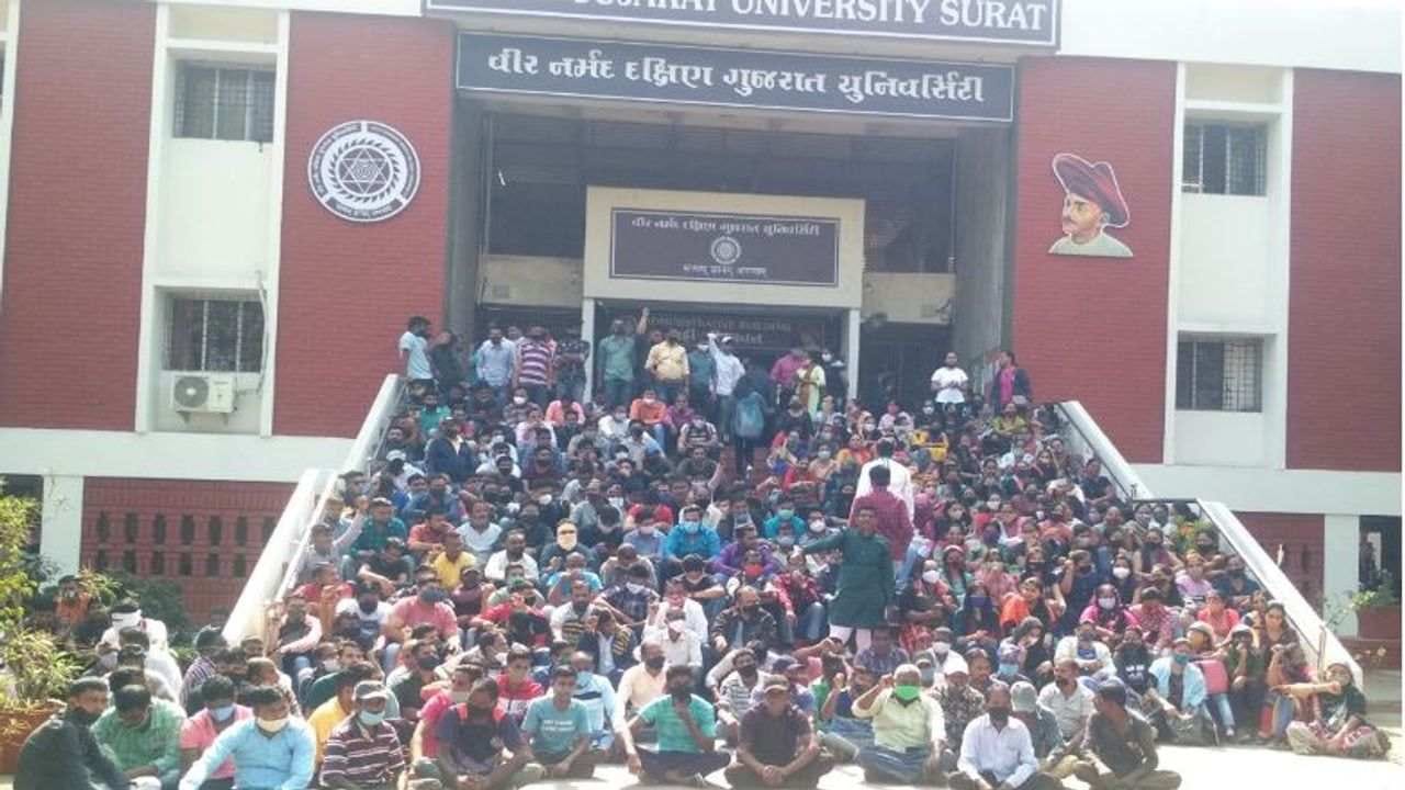 Surat : યુનિ. કેમ્પસમાં 11 માસનો કરાર રિન્યુ કરવાની માંગ સાથે 400 હંગામી કર્મચારીઓ દ્વારા સૂત્રોચ્ચાર સાથે વિરોધ પ્રદર્શન