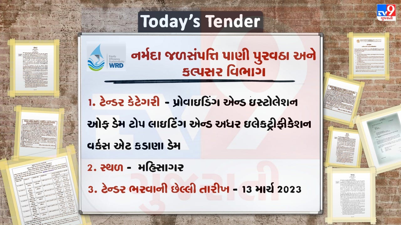 Tender Today : નર્મદા જળસંપત્તિ પાણી પુરવઠા અને કલ્પસર વિભાગ દ્વારા કડાણા ડેમ પરના કામો માટે ટેન્ડર જાહેર, જાણો ટેન્ડર ભરવાની છેલ્લી તારીખ