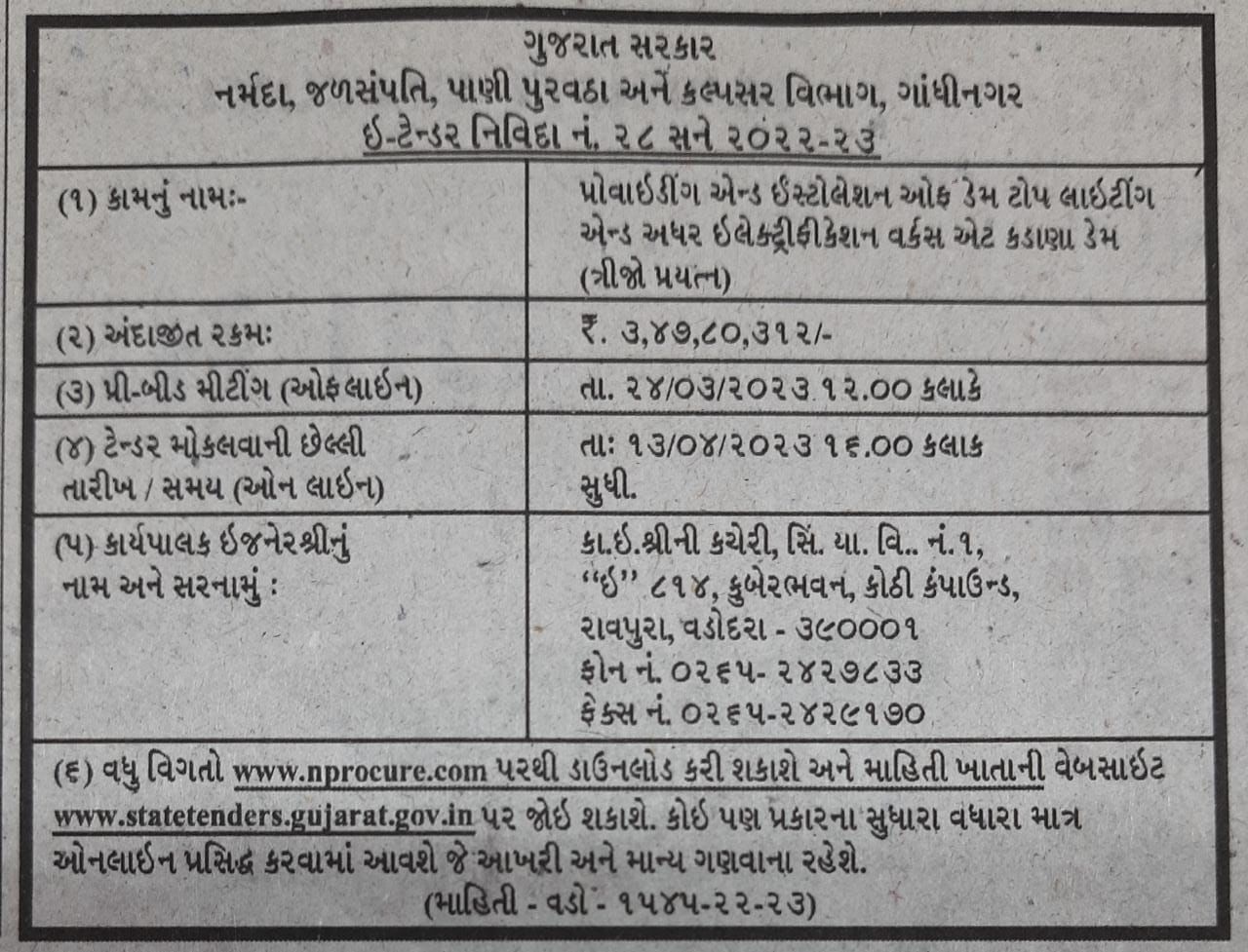 Vadodara News : પ્રોવાઇડિંગ એન્ડ ઇંસ્ટોલેશન ઓફ ડેમ ટોપ લાઇટિંગ એન્ડ અધર ઇલેકટ્રીફીકેશન વર્કસ એટ કડાણા ડેમ માટે ટેન્ડર બહાર પાડવામાં આવ્યુ છે.
