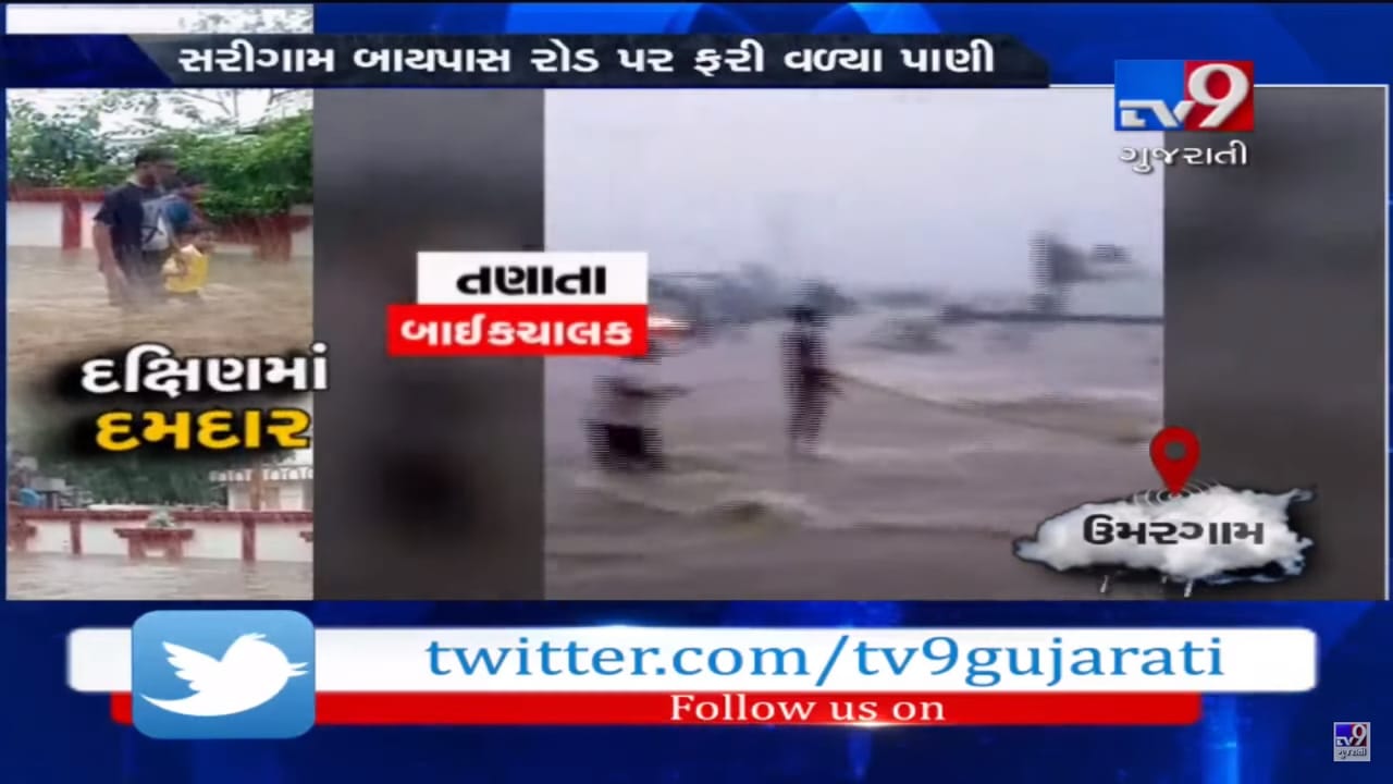 વલસાડ જિલ્લામાં ભારે વરસાદ વરસી રહ્યો છે. ઉમરગામ તાલુકામાં એકધારા વરસાદથી નદી-નાળા બે કાંઠે વહેવા લાગ્યા છે. સરીગામ બાયપાસ રોડ પાણીમાં ગરકાવ થઈ ગયો છે. આ બાયપાસ પર પસાર થતા 3 બાઈક સાથે 4 વાહન ચાલકો પાણીના વહેણમાં તણાવા લાગ્યા હતા. જો કે ફાયર બ્રિગેડે રેસ્કયૂ કરીને તમામ 4 બાઈક ચાલકોને બચાવી લીધા છે. ભારે વરસાદને કારણે સરીગામ બાયપાસ રોડ પર પાણી ફરી વળતા લોકોને પસાર ન થવાની પણ તંત્રએ તાકીદ કરી છે.