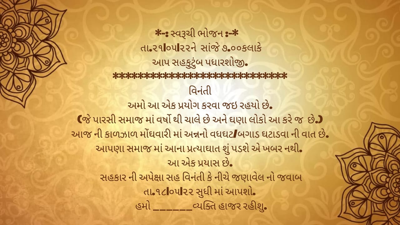 પરિણામે લગ્ન-પ્રસંગમાં અન્ન અને પૈસાનો બગાડ થતો હોય છે,પરંતુ આ પરિવારે(Desai Family) આ વાતને ગંભીરતાથી લઈ નવો ચીલો જ ચાતર્યો છે. સમાજમાં પ્રથમ વખત બંસરીના પિતા ભદ્રેશભાઈએ સગાં-વ્હાંલાઓને વિશ્વાસમાં લઈને લગ્નની ઈ-કંકોત્રીની સાથે એક ઈ-કાર્ડ પણ છપાવ્યું છે,આ ઈ-કાર્ડમાં આમંત્રિતોને પુછાય છે કે દિકરીના લગ્નમાં તમે કેટલાં લોકો જમાણવારમાં પધારશો. પરીવારના આ અભિગમને સ્વજનો અને આમંત્રિતોએ પણ આવકારી રહ્યા છે.