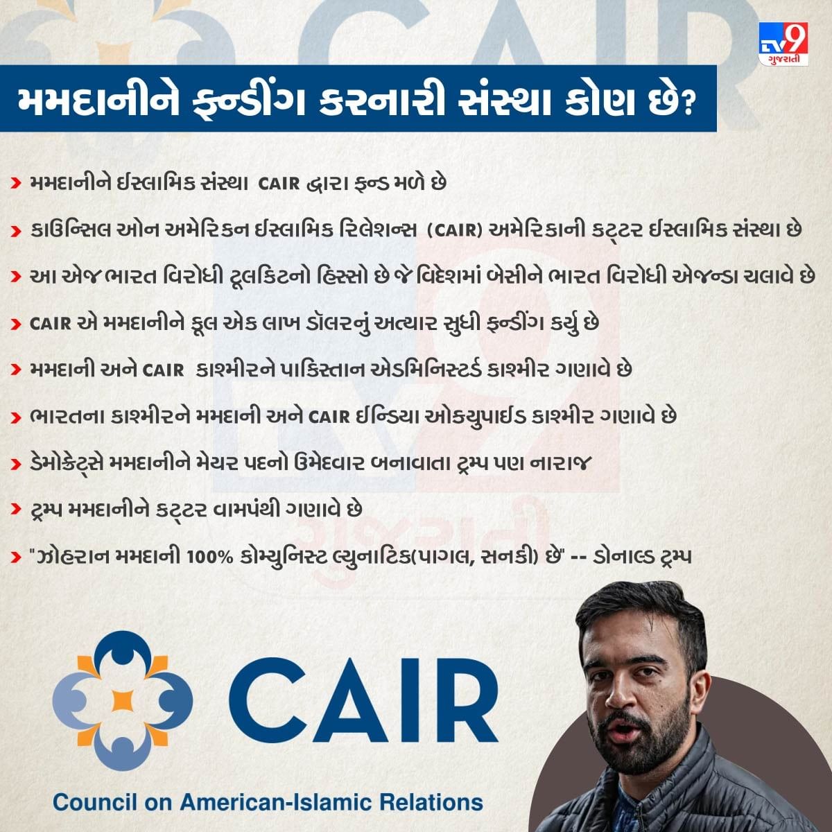 મમદાનીને અમેરિકન ઇસ્લામિક સંગઠન CAIR તરફથી ભંડોળ મળ્યું છે, જેના પર ભારત અને હિન્દુઓ વિરુદ્ધ નફરત ફેલાવવાનો આરોપ છે. જે CAIR ઝોરહાન મમદાનીને ફન્ડીંગ કરી રહી છે. આ એજ સંસ્થા છે જે ભારતમાં ઓપરેશન સિંદૂર બાદ પાકિસ્તાન પર કરાયેલા હુમલા મામલે સવાલ ઉઠાવી રહી હતી. એ સમયે ઓપરેશન સિંદૂર દ્વારા પાકિસ્તાન સામે કરાયેલી કાર્યવાહી પર આપત્તિ વ્યક્ત કરી હતી. તે કહે છે કે CAIR અમેરિકાની સૌથી મોટી મુસ્લિમ રાઈટ્સની સંસ્થા છે જે ભારતની દક્ષિણપંથી અને એન્ટી મુસ્લિમ હિંદુત્વ સરકારની પાકિસ્તાનના નાગરિકો અને મસ્જિદો પર બોંબ ફેંકવાની નિંદા કરે છે.
