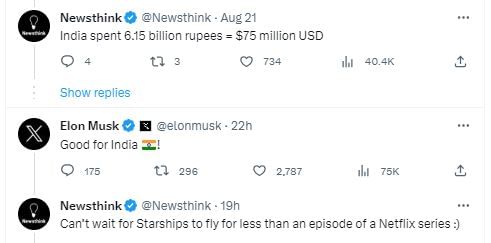 ભૂતપૂર્વ પત્રકાર સિન્ડી પોમે X (અગાઉ ટ્વિટર) પર શેર કર્યું હતું કે જ્યારે તમે જાણશો કે ભારતના ચંદ્રયાન-3 ($75 મિલિયન)નું બજેટ ઈન્ટરસ્ટેલર ($165 મિલિયન) કરતાં ઓછું છે ત્યારે તમે પાગલ થઈ જશો. આના જવાબમાં એલોન મસ્કે જવાબ આપ્યો “ભારત માટે સારું !” પોસ્ટ કર્યું અને દેશનો ધ્વજ દર્શાવતું ઇમોજી પણ ઉમેર્યું. આ જવાબ 60,000 થી વધુ વખત જોવામાં આવ્યો છે, અને સંખ્યા ઝડપથી વધી રહી છે. તેમજ શેર પર 1,900 થી વધુ લાઈક્સ પણ આવી છે.