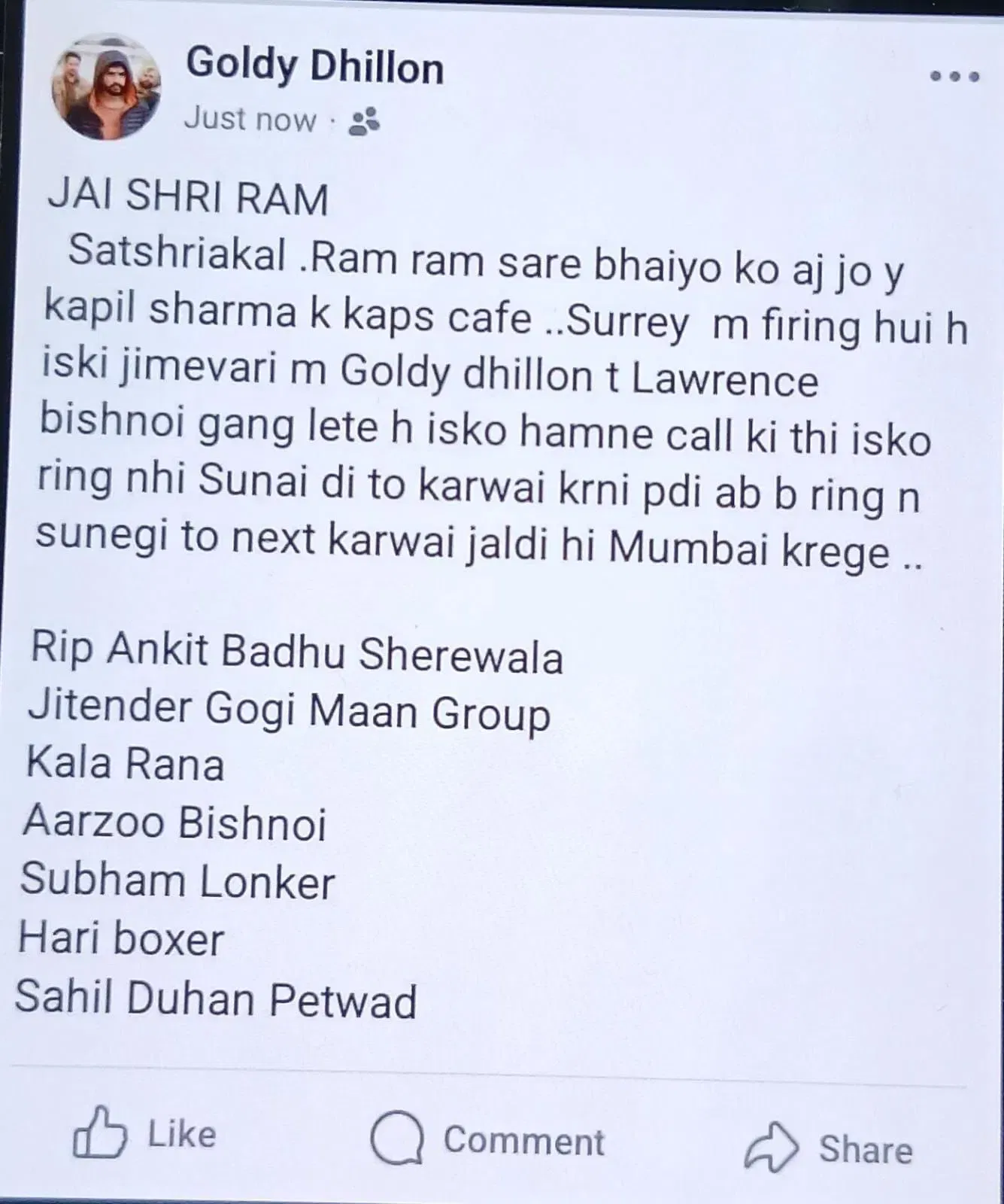 ગોળીબાર પછી, ગોલ્ડી ધિલ્લોન નામના સોશિયલ મીડિયા એકાઉન્ટની એક પોસ્ટ વાયરલ થઈ રહી છે. પોસ્ટમાં લખ્યું છે, “જય શ્રી રામ. સતશ્રી અકાલ. બધા ભાઈઓને રામ રામ. હું એટલે ગોલ્ડી ધિલ્લોન અને લોરેન્સ બિશ્નોઈ ગેંગ આજે કપિલ શર્માના કેપ્સ કાફેમાં થયેલી ગોળીબારની જવાબદારી સ્વીકારીએ છીએ.”