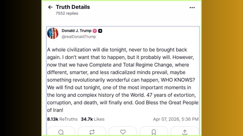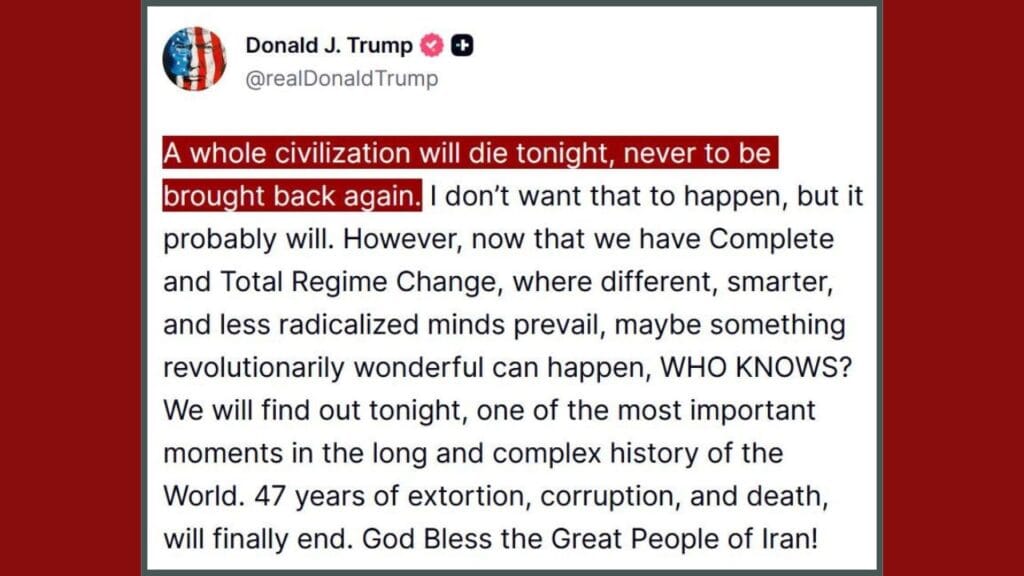 ટ્રમ્પે પોતાની સોશિયલ મીડિયા પોસ્ટમાં કહ્યું છે કે, “આજે રાત્રે એક આખી સભ્યતા ખતમ થઈ શકે છે, જે ફરી ક્યારેય પાછી નહીં આવે.” તેમણે એમ પણ ઉમેર્યું કે, તેઓ આવું ઈચ્છતા નથી પરંતુ સંજોગો આવા બની રહ્યા હોય તેવું દેખાય છે.