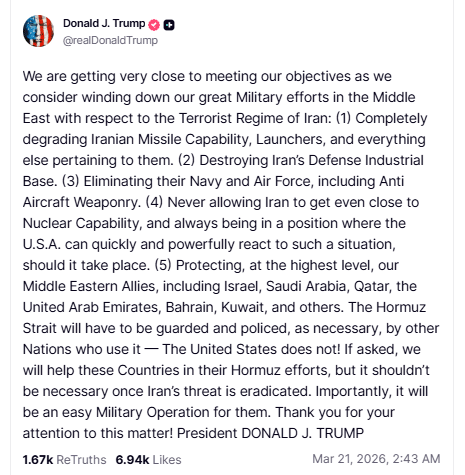 યુએસ-ઈરાન સંઘર્ષના 21મા દિવસે, રાષ્ટ્રપતિ ડોનાલ્ડ ટ્રમ્પે એક આશ્ચર્યજનક “એક્ઝિટ પ્લાન” શેર કર્યો છે. “ટ્રુથ સોશિયલ” પર પ્રકાશિત એક વિગતવાર પોસ્ટમાં, ટ્રમ્પે દાવો કર્યો હતો કે યુનાઇટેડ સ્ટેટ્સ તેના લશ્કરી ઉદ્દેશ્યો પ્રાપ્ત કરવાની “અત્યંત નજીક” છે અને હવે મધ્ય પૂર્વમાં તેના મુખ્ય ચાલુ લશ્કરી કાર્યવાહીને ધીમે ધીમે સમાપ્ત કરવાનું વિચારી રહ્યું છે.