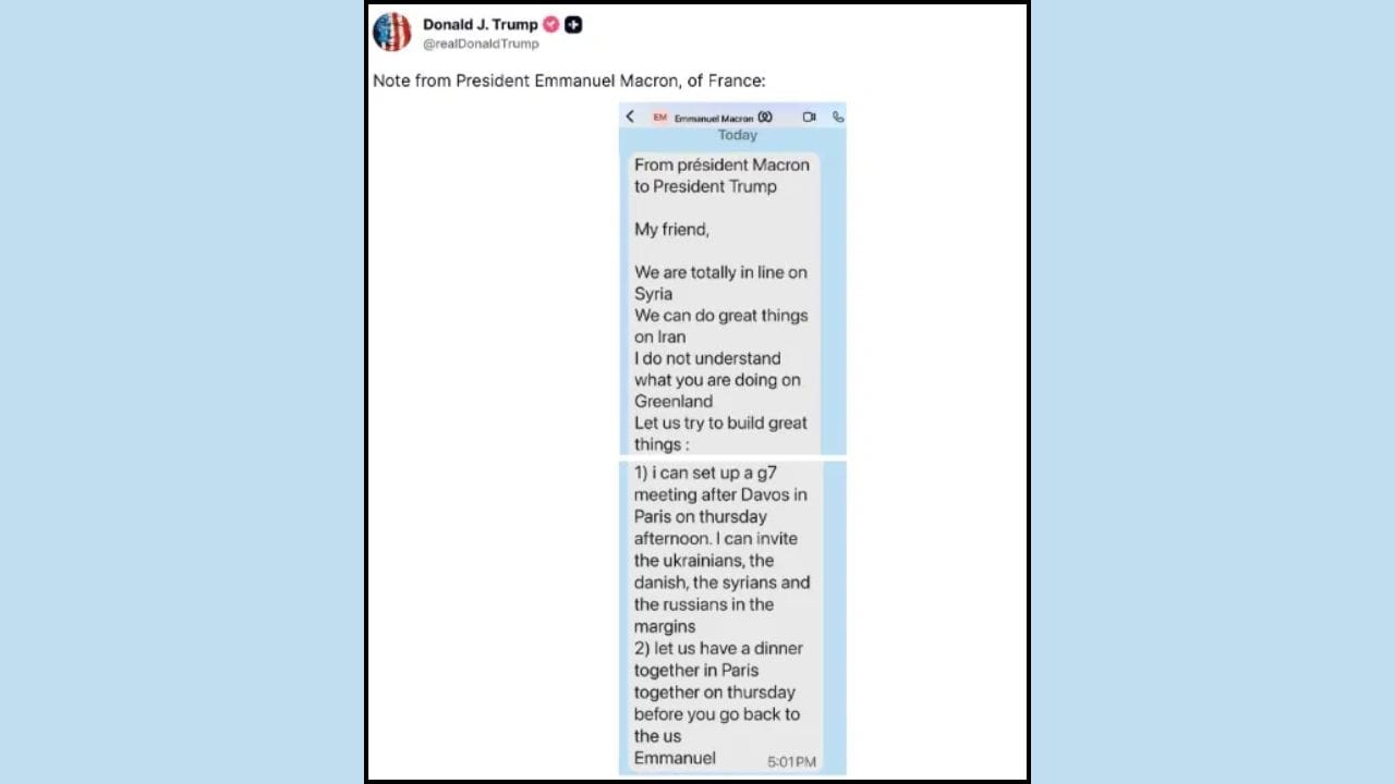 ટ્રમ્પે તેમના સોશિયલ મીડિયા પ્લેટફોર્મ ‘ટ્રુથ સોશિયલ’ પર મેક્રોનના એક ખાનગી મેસેજનો સ્ક્રીનશોટ શેર કર્યો છે. તે ચેટમાં મેક્રોને લખ્યું છે કે, “સીરિયાના મુદ્દે અમે તમારી સાથે સંપૂર્ણ રીતે સંમત છીએ. ઈરાનના કિસ્સામાં આપણે ઘણું બધું કરી શકીએ છીએ પરંતુ મને સમજાતું નથી કે તમે ગ્રીનલેન્ડમાં શું કરી રહ્યા છો?”