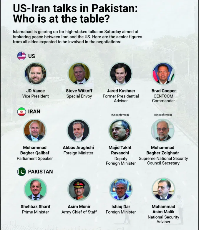 યુએસ અને ઈરાન વચ્ચે ઇસ્લામાબાદમાં થઈ રહેલી વાટાઘાટોમાં બંને દેશોના અત્યંત પ્રભાવશાળી વ્યક્તિઓ ભાગ લેશે. ઈરાનના વિદેશ પ્રધાનથી લઈને રાષ્ટ્રપતિ ટ્રમ્પ સાથે ગાઢ રીતે સંકળાયેલા વ્યક્તિઓ સુધીના સહભાગીઓ ભાગ લેશે.