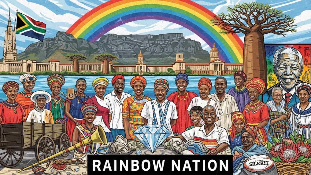 ‘રેઈન્બો નેશન’ શબ્દ દક્ષિણ આફ્રિકા માટે પ્રયોજવામાં આવ્યો હતો, જેથી ત્યાં વસતી વિવિધ સંસ્કૃતિઓ, જાતિઓ અને સમુદાયોની એકતાને વિશ્વ સમક્ષ દર્શાવી શકાય. મેઘધનુષના સાત રંગોની જેમ આ દેશ અલગ-અલગ ભાષા અને ધર્મના લોકોના સંગમથી બનેલો છે. ‘રેઈન્બો નેશન’ એ દક્ષિણ આફ્રિકાનું વિશ્વ વિખ્યાત ઉપનામ છે. આ શબ્દનો અર્થ એ છે કે આ દેશ સંસ્કૃતિ, જાતિ, ધર્મ અને ભાષાઓની બાબતમાં અત્યંત વિવિધતા ધરાવે છે. જેમ મેઘધનુષમાં અનેક રંગો હોય છે, તેમ આ દેશમાં અનેક સંસ્કૃતિઓનો સુમેળ જોવા મળે છે.