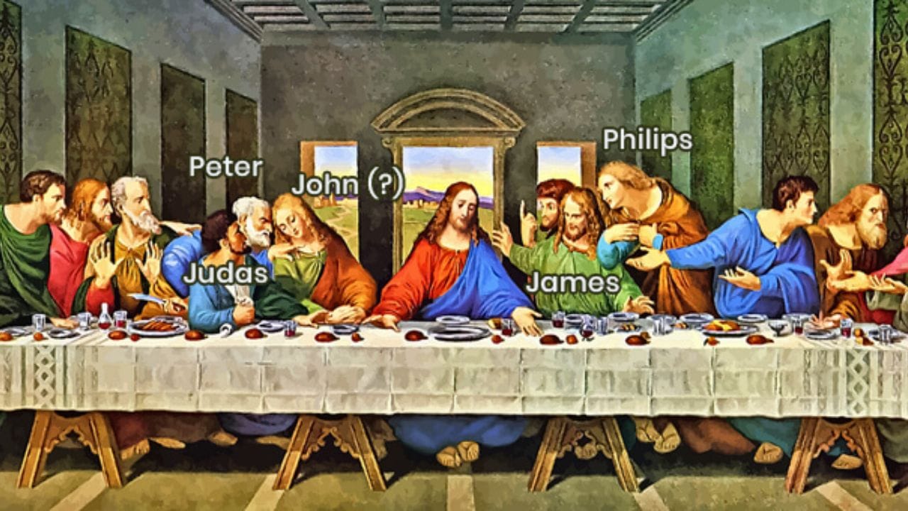 બાઇબલ મુજબ, જ્યારે ઇસુ કહે છે કે “તમારામાંથી એક મને દગો કરશે”, ત્યારે તેના શિષ્યોમાંના એક “ફિલિપ્સ” પૂછે છે “પ્રભુ, શું હું તે દેશદ્રોહી છું?”. જીસસ ભવિષ્યવાણી કરે છે કે તેનો દગો આપનાર તેની સાથે બ્રેડનો ટુંકડો ઉઠાવશે. આપણે જોઈ શકીએ છીએ કે તેના એક શિષ્ય “જેમ્સ” જીસસ આ બોલ્યા પછી તેના હાથ પાછળ કરી નાખે છે. અન્ય શિષ્ય “જુડસ” નું ધ્યાન “પીટર” અને “જ્હોન” ના શબ્દોથી વિચલિત થાય છે અને તેણે બ્રેડ લેવા માટે હાથ લંબાવ્યો અને તે જ સમયે ઈસુએ પણ બ્રેડ ઉપાડવા હાથ લંબાવ્યો. બ્રેડ. જેમ આપણે પેઇન્ટિંગમાં જોઈ શકીએ છીએ “જુડસ” એ વ્યક્તિ હતો જેણે ઈસુને દગો આપ્યો હતો.