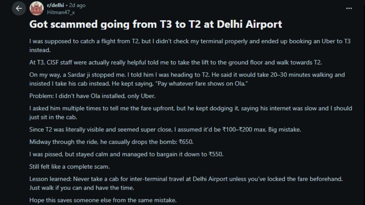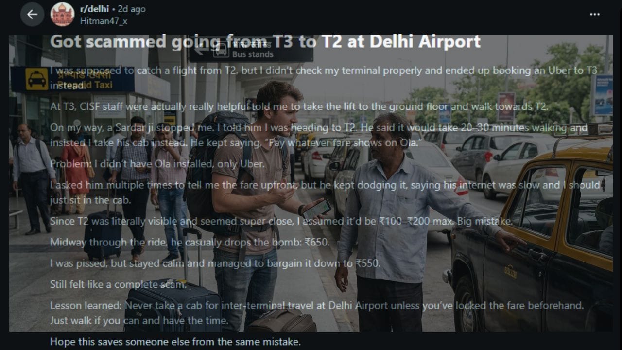 ભારતના સૌથી વ્યસ્ત એવા દિલ્હીના ઈન્દિરા ગાંધી ઈન્ટરનેશનલ એરપોર્ટ પર સ્કેમર્સ કેવી રીતે સક્રિય હોય છે, તેનો જીવતો જાગતો પુરાવો એક રેડિટ (Reddit) યુઝરે શેર કર્યો છે. આ ઘટના એવા લોકો માટે ચેતવણી સમાન છે જેઓ એરપોર્ટ પર ઉતાવળમાં ટેક્સી ભાડે કરે છે.