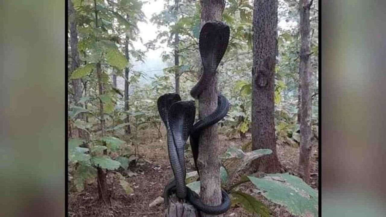 આ તસવીરે હાલ સોશિયલ મીડિયા યુઝર્સનું ધ્યાન ખેંચ્યુ છે. તમને જણાવી દઈએ કે, આ તસવીર મહારાષ્ટ્રના મેલઘાટના જંગલોની છે. જ્યાં એક ચોંકાવનારો નજારો જોવા મળ્યો હતો. વાયરલ થઈ રહેલા ફોટામાં જોઈ શકાય છે કે કાળા રંગના ત્રણ કોબ્રા ઝાડની આસપાસ એકબીજા સાથે લપેટાયેલા છે.