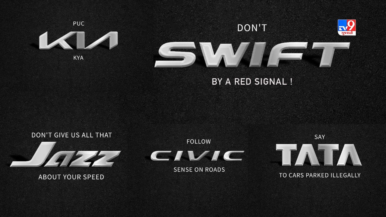 ખોટી કાર પાર્કિંગને TATA કહો, રોડ પર મહિન્દ્રા બાહુબલી ન બનો, રસ્તા પર CIVIC સેન્સનું પાલન કરો, ફોર્ચ્યુન(2) સલામત લોકોને સપોર્ટ કરે છે, રોડ સિગ્નલ સાથે SWIFT ન કરો, તમારી ઝડપનો JAZZ આપો. દરેક પોસ્ટ પર અલગ-અલગ કારના લોગો પણ મુકવામાં આવ્યા છે.