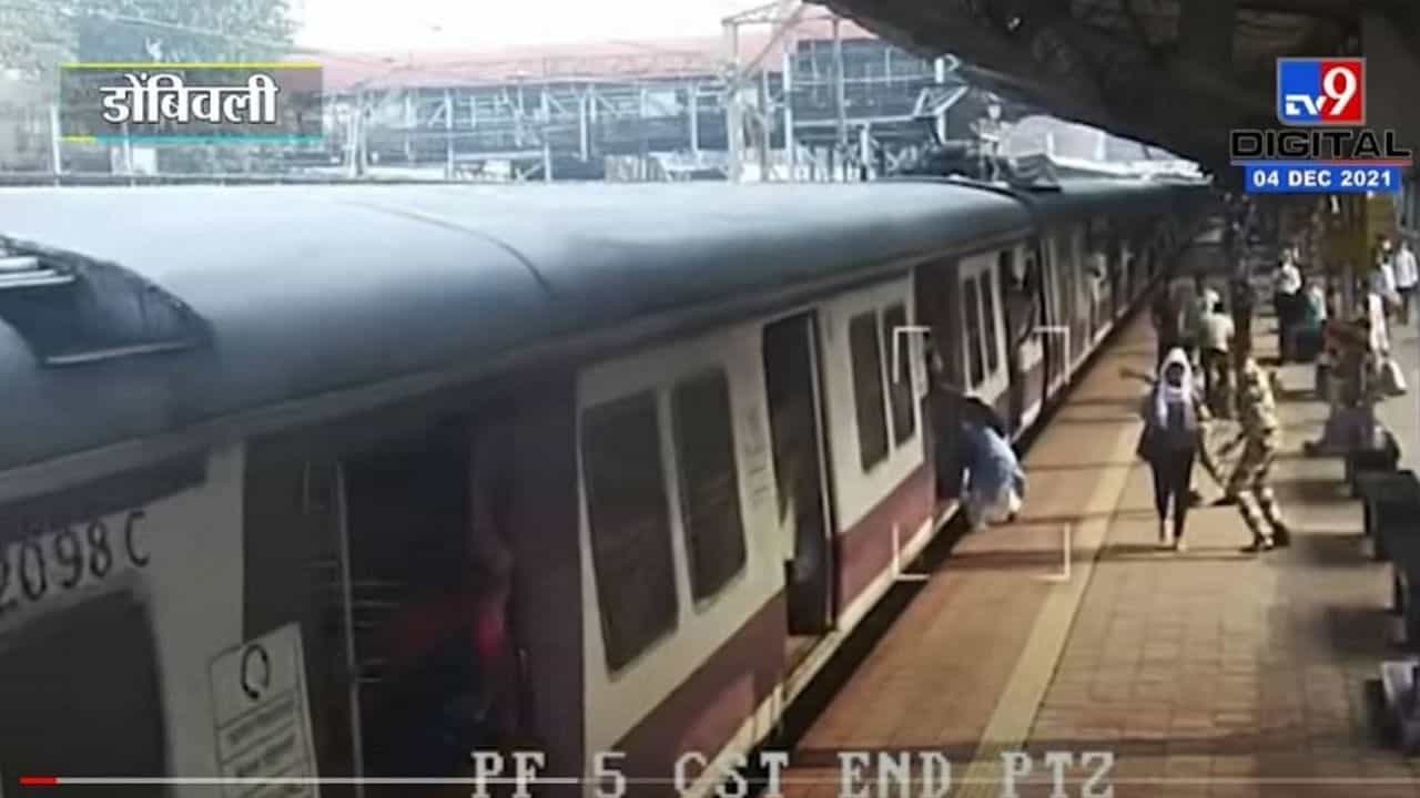 #WATCH | Maharashtra security personnel saves a woman from falling into the gap between platform and train while she was boarding the running train at Dombivli railway station