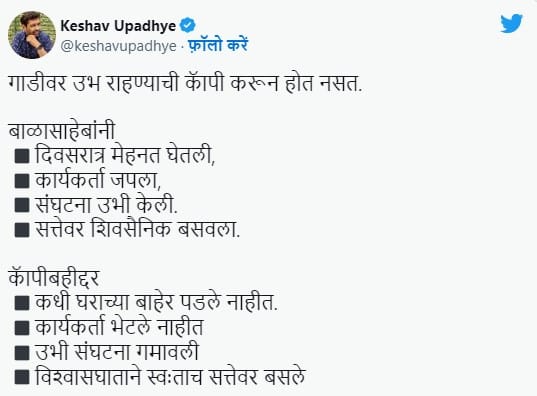 બીજેપી પ્રવક્તાએ પોતાના ટ્વિટમાં લખ્યું છે કે, ‘કાર પર ઉભા રહીને નકલ કરવાથી કંઈ થશે નહીં. બાળાસાહેબ ઠાકરેએ દિવસ-રાત મહેનત કરી હતી. કાર્યકરોની સંભાળ લીધી, સંસ્થાની રચના કરી. શિવ સૈનિકોને સત્તા પર લાવવામાં આવ્યા.પરંતુ કોપી બહાદુર ક્યારેય ઘરની બહાર નીકળ્યા નથી, કાર્યકરોને મળ્યા નથી. છેતરપિંડી કરીને સત્તા લીધી અને બાદમાં પાર્ટી ગુમાવી.’ કેશવ ઉપાધ્યાયે આ ટ્વિટ કરીને ઉદ્ધવ ઠાકરેની બાળાસાહેબ ઠાકરે સાથેની સરખામણીની મજાક ઉડાવી હતી.