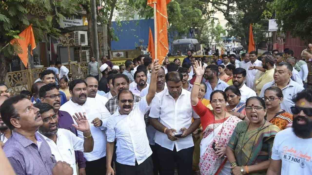 #WATCH Shiv Sena workers protest outside the residence of Amravati MP Navneet Rana in Mumbai as the MP plans to chant Hanuman Chalisa along with her husband MLA Ravi Rana outside ‘Matoshree’ the residence of #Maharashtra CM Uddhav Thackeray pic.twitter.com/OR7CQQpWlk
