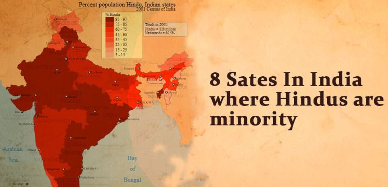 વસતી ગણતરી 2011ના આંકડાઓ મુજબ જે 8 રાજ્યોમાં હિન્દુઓની સંખ્યા ઓછી છે, તેમાં લક્ષદ્વીપ (2.5 ટકા), મિઝોરમ (2.75 ટકા), નાગાલૅંડ (8.75 ટકા), મેઘાલય (11.53 ટકા), જમ્મુ-કાશ્મીર (28.44 ટકા), અરુણાચલ પ્રદેશ (29 ટકા), મણિપુર (31.39 ટકા) અને પંજાબ (38.40 ટકા).