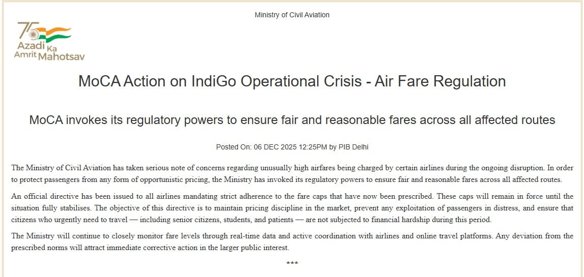 નાગરિક ઉડ્ડયન મંત્રાલયે, ઇન્ડિગો એરલાઈન્સની કટોકટી બાદ, અન્ય વિમાની સેવાઓએ વધારી દીધેલા વિમાની ભાડાને પહોંચી વળવા માટે, તાત્કાલિક અસરથી ભાડા મર્યાદા લાગુ કરી છે. મુસાફરોને વધુ પડતા ભાવની ટિકિટોથી બચાવવા માટે સરકારે હસ્તક્ષેપ કરીને આ પગલું લેવામાં લીધુ છે. નાગરિક ઉડ્ડયન મંત્રાલય હવે વાસ્તવિક સમયમાં હવાઈ ભાડા પર નજર રાખશે અને નિયમોનું ઉલ્લંઘન કરનારી એરલાઇન્સ સામે કાર્યવાહી કરશે.