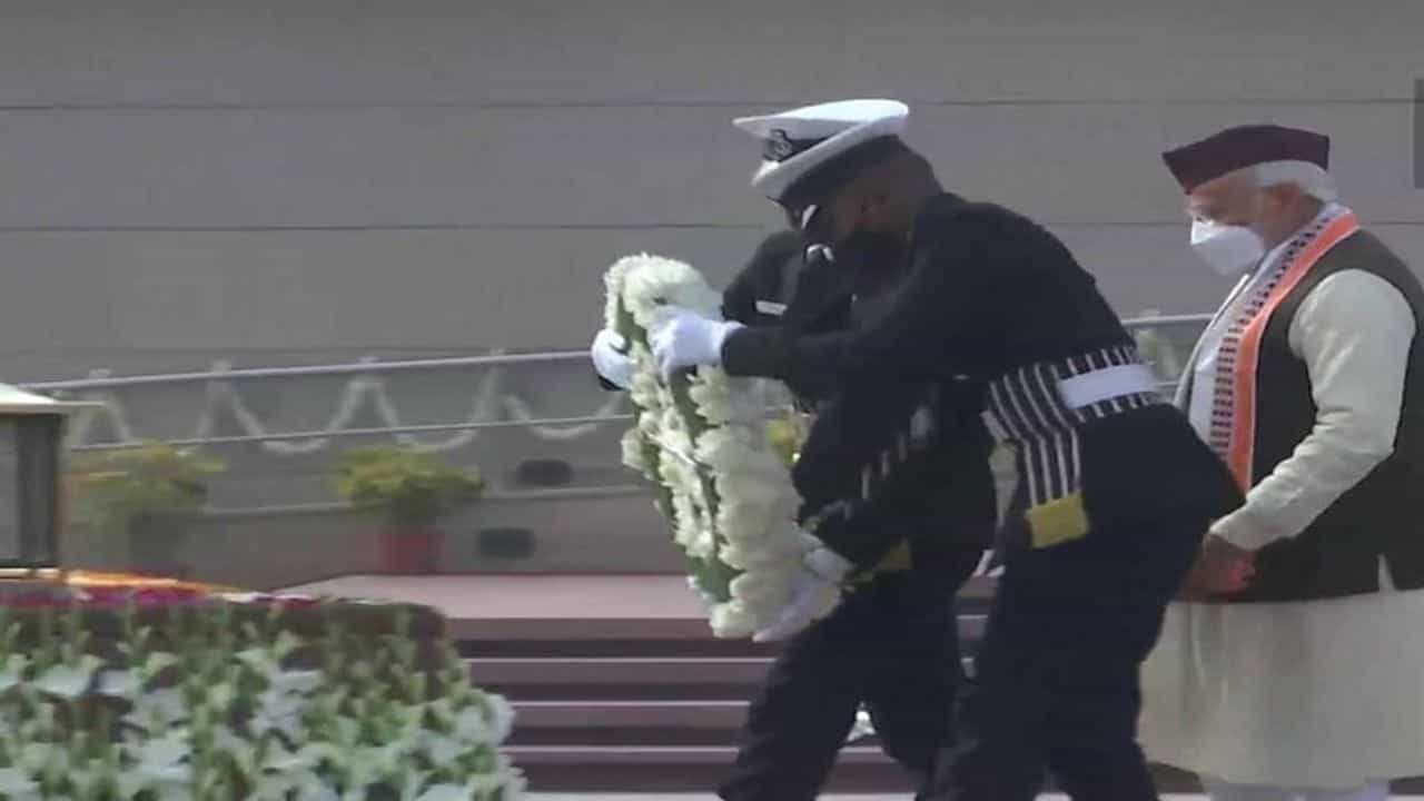 Republic Day 2022: વડા પ્રધાન નરેન્દ્ર મોદીએ (PM Narendra Modi) રાષ્ટ્રીય યુદ્ધ સ્મારક (National war memorial) ખાતે 73મા પ્રજાસત્તાક દિવસના અવસર પર રાષ્ટ્રીય યુદ્ધ સ્મારક પર પુષ્પાંજલિ અર્પણ કરીને શહીદોને શ્રદ્ધાંજલિ આપી હતી.આ દરમિયાન વડાપ્રધાન મોદીના માથા પર ઉત્તરાખંડની ટોપી જોવા મળી, આ સિવાય તેમના ગળામાં મણિપુરની માળા પણ જોવા મળી હતી.
