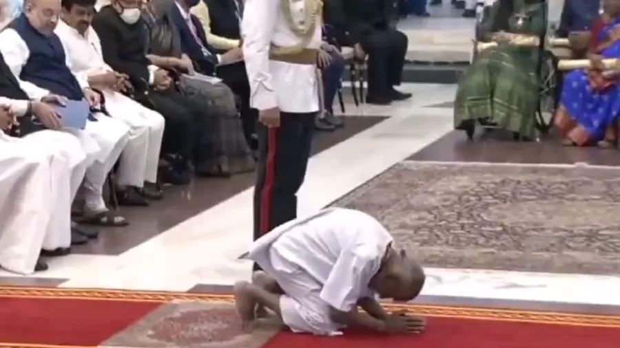 તમે જોયું જ હશે કે સોશિયલ મીડિયા પર એક વીડિયો વાયરલ થઈ રહ્યો છે, જે રાષ્ટ્રપતિ ભવન પદ્મ એવોર્ડ સમારોહનો છે. આ વીડિયોમાં એક વૃદ્ધ વ્યક્તિ જોવા મળે છે, જે સૌથી પહેલા વડાપ્રધાન નરેન્દ્ર મોદીને જમીન પર બેસીને નમન કરે છે.