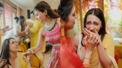 આગલી તસવીરમાં, તે રડી રહી છે. કારણ કે તેને મહેંદી કરી હતી ત્યારે તેને તેની BFF આલિયા ભટ્ટનો હાથ પકડી લીધો હતો. આગળની બે તસવીરોમાં આકાંક્ષા વધુ રડતી જોઈ શકાય છે. આ તસવીરો શેયર કરતાં તેણે લખ્યું, "આકાંક્ષા રંજન કપૂરની લાગણી દરેક લગ્નની વિધિમાં વધી રહી છે."