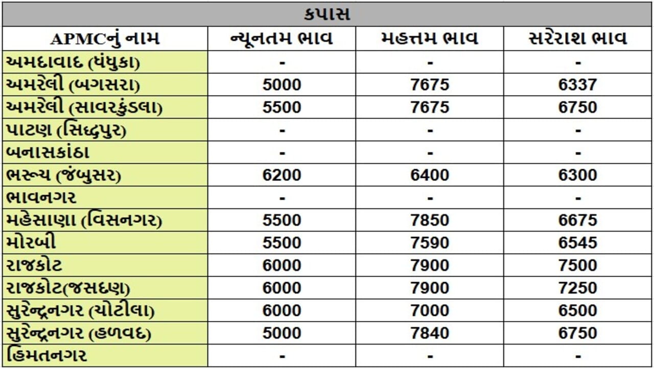 APMC Market Rates : રાજકોટ APMCમાં કપાસના મહત્તમ ભાવ રૂપિયા 7900 રહ્યા, જાણો જુદા-જુદા પાકના ભાવ