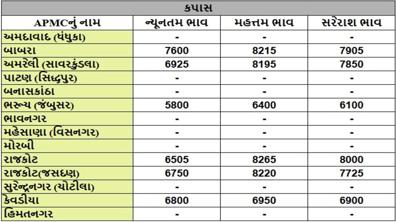 કપાસના તા.19-08-2025ના રોજ APMCના ભાવ રૂ.5800 થી 8265 રહ્યા.