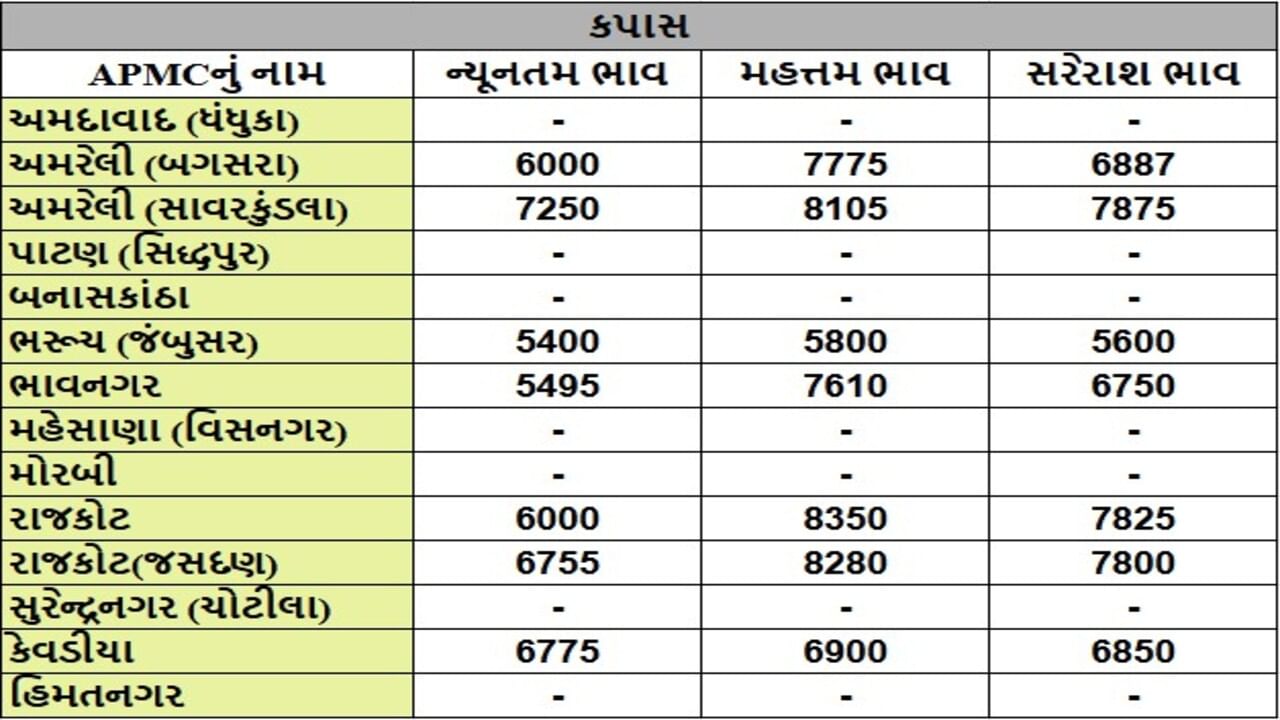કપાસના તા.08-07-2025ના રોજ APMCના ભાવ રૂ.5400 થી 8350 રહ્યા.